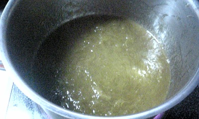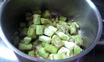 葉柄をざくざくと切り、砂糖と一緒に鍋に入れて火にかけます。