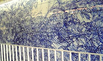カフェの壁画にブルーの椿を描いたのは田窪恭治氏。