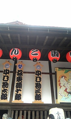芝居小屋の太鼓の音が「どんと来い」「どんと来い」と鳴っています。