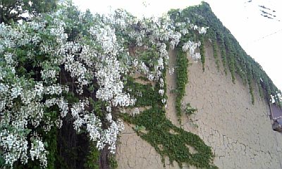 崩れかけた土壁に藤の花がみごとに絡む、こんなアートにも出会えます。