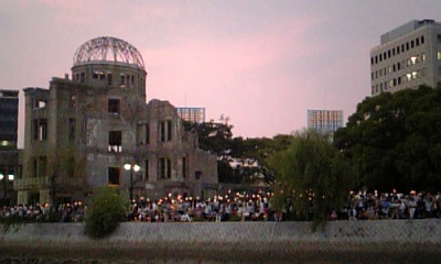 暮れなずむ空に浮かぶ原爆ドームが頭上に頂く有刺鉄線が、