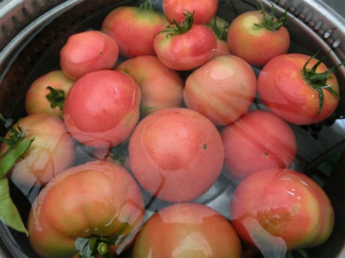 とったばかりのトマトを水で冷やし、