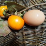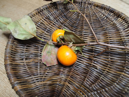 「マメ柿」と名前もかわいい、小さな柿。山に自生する、柿の原種です。卵よりもひとまわり小さく、手のなかにおさまる大きさ。渋柿なので鳥に食べられることもなく、山で鈴なりになっていました。植物のシブやアクは、動物から身を守る術なのです。