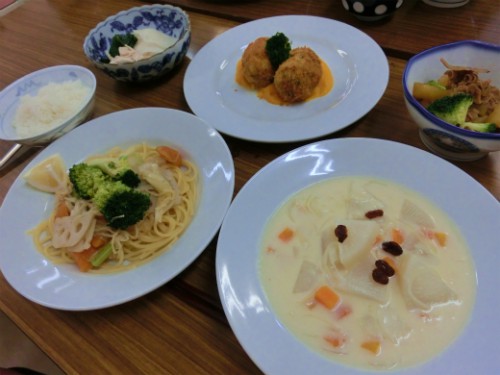 レモンと小松菜のコロッケ、れんこんと冬野菜のパスタ、