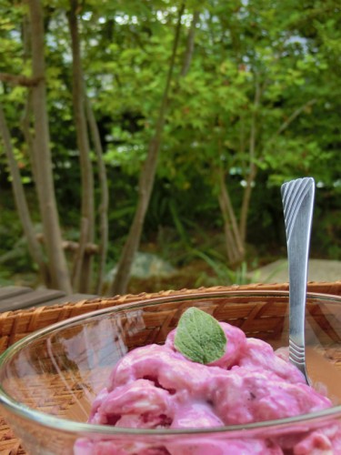 けさは、ゆうべのうちにヨーグルトに赤紫蘇シロップを入れて冷凍しておいたシャーベット。