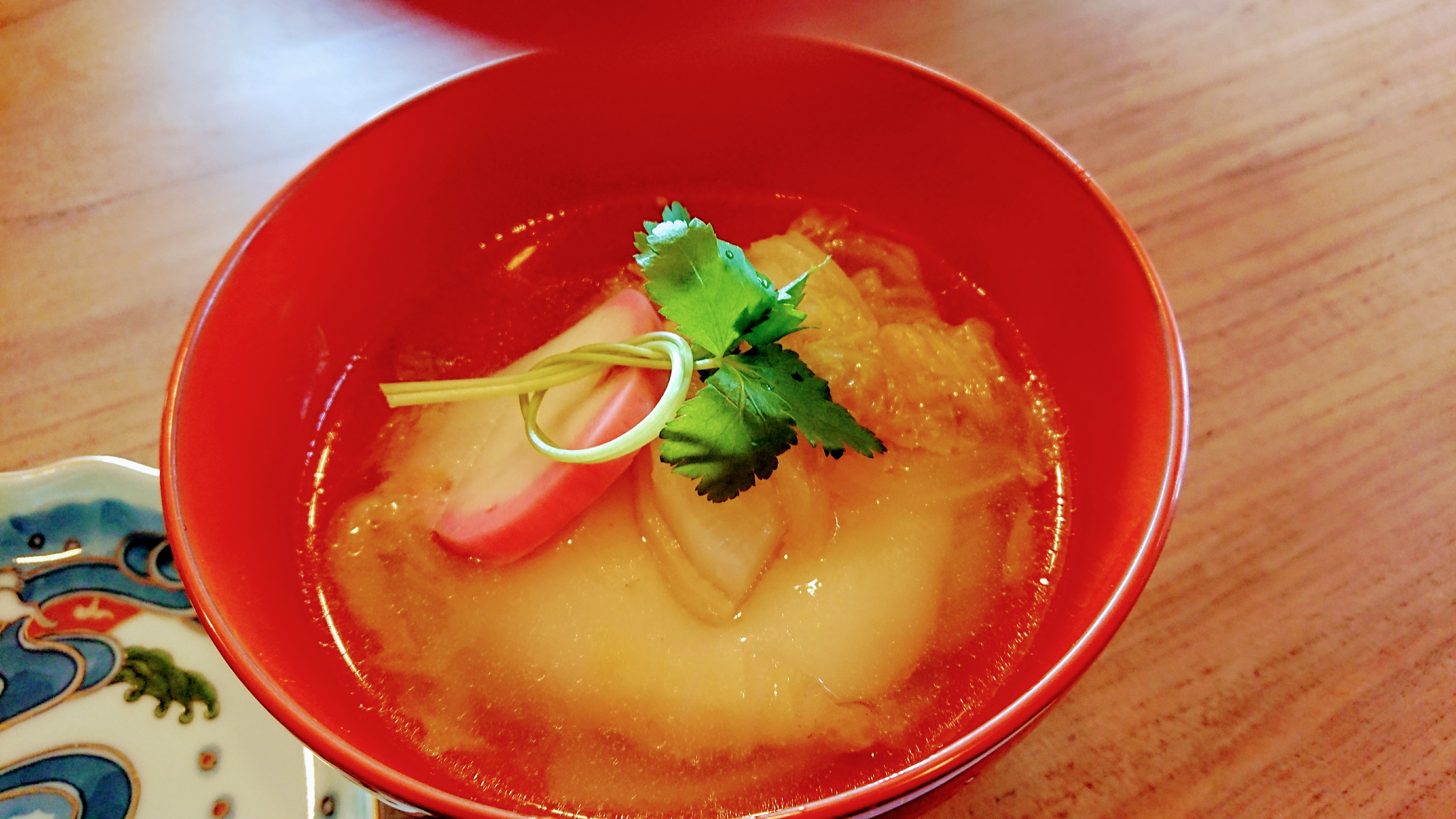 元旦のお雑煮もいつもと同じ。昆布とカツオの合わせだしに白だしを足し、鶏もも肉、大根、白菜、かまぼこ、三つ葉。お餅は、茹でた丸餅。