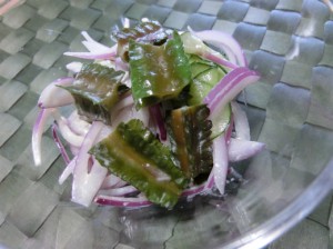 ②10分くらい置き、しんなりしたら塩を洗い流し、水気をしっかりとしぼる。