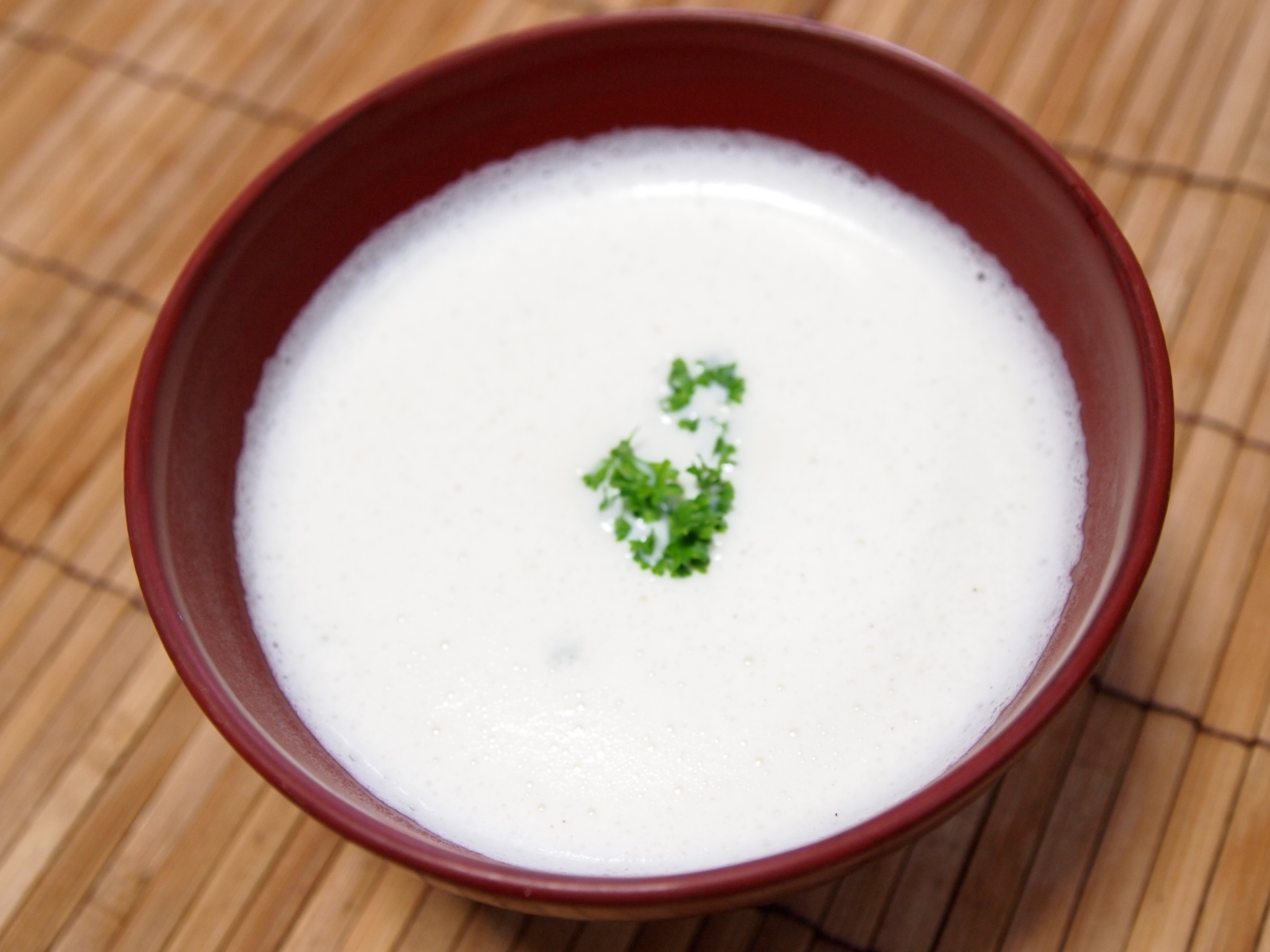 茹でてミキサーにかけたら雪のように白いスープが出来上がりました。