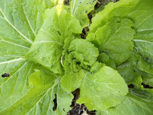畑の白菜が虫に喰われながらも元気に葉を広げています。