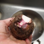 野菜市に「赤芽芋」が入ったので、さっそく鍋に入れてみました。