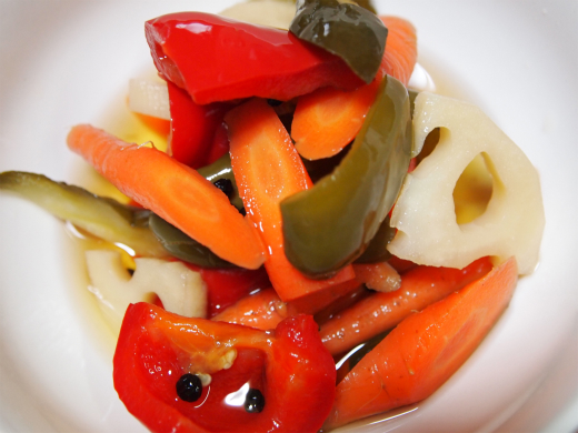 ピクルス液の割合・・・・・米酢1カップ、水1カップ、三温糖80g、塩大さじ1、赤唐辛子(種をぬく)、ローリエ1枚、黒粒こしょう20粒