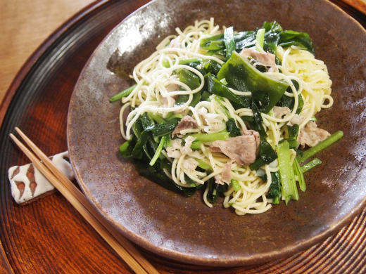 ④焼きそばの麺と併せて炒め、最後にワカメを加えて出来上がり!