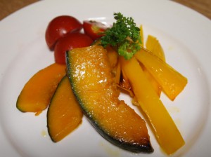 ④カボチャとパプリカ、彩りにプチトマトを盛り、③を回しかける。