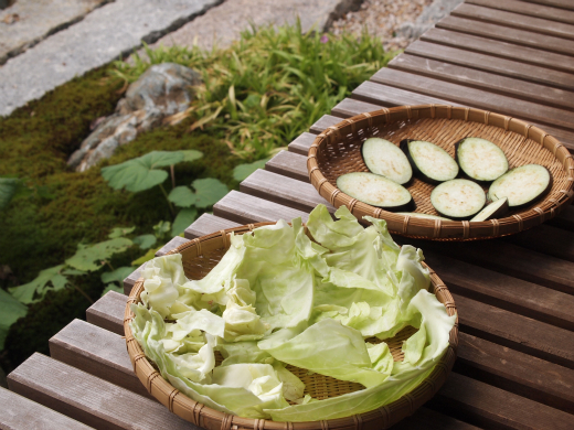まずはキャベツとナス。洗って切ってザルの上に広げて。