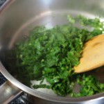 ①熱したフライパンに、細かく刻んだ葉を入れる。