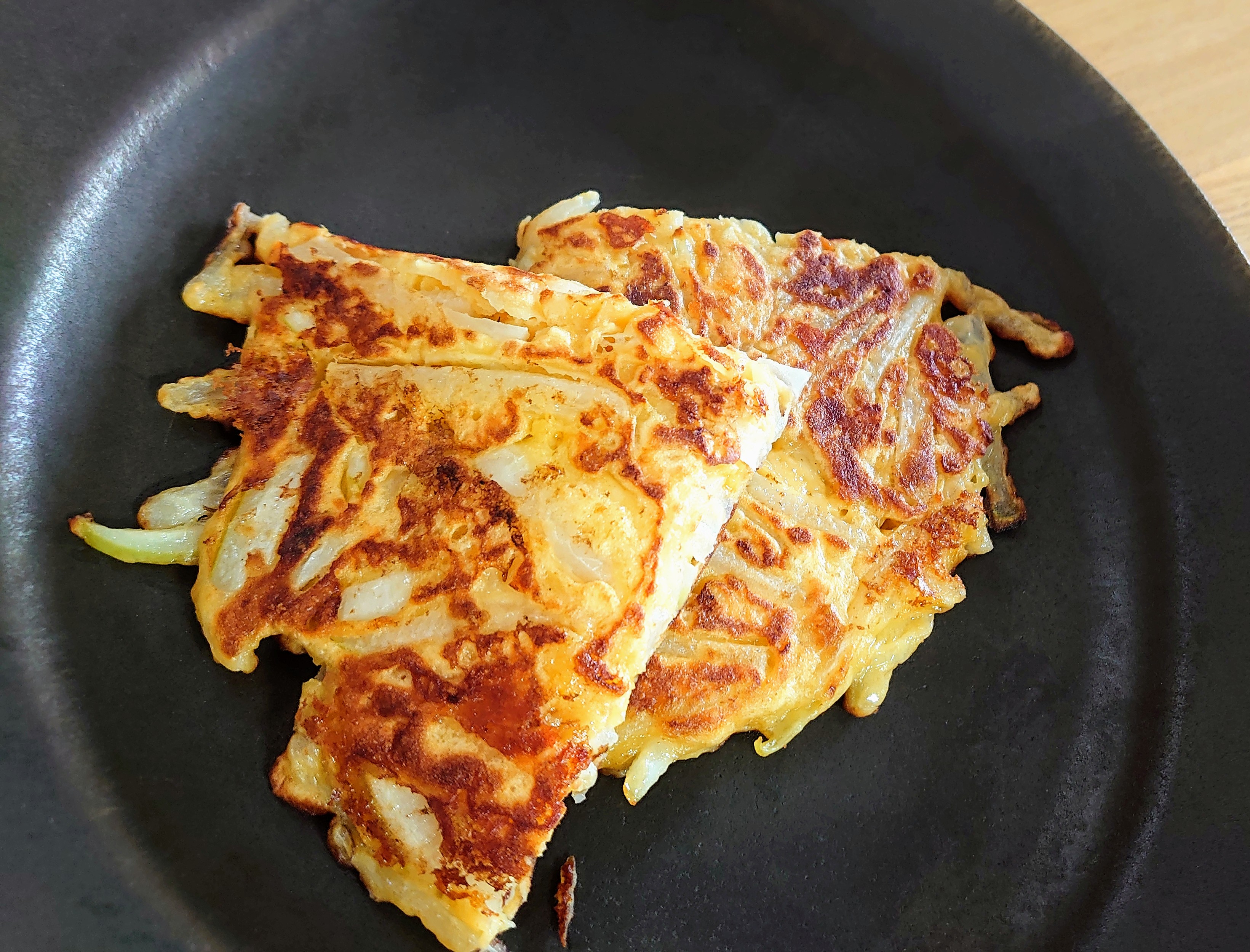 ③油を熱したフライパンに②の半量を丸く敷き、フタをして中火で約3分焼く。