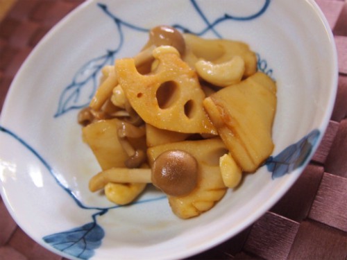旬を迎えた蓮根を、さっそくキンピラにして。カシューナッツとしめじを加えました。