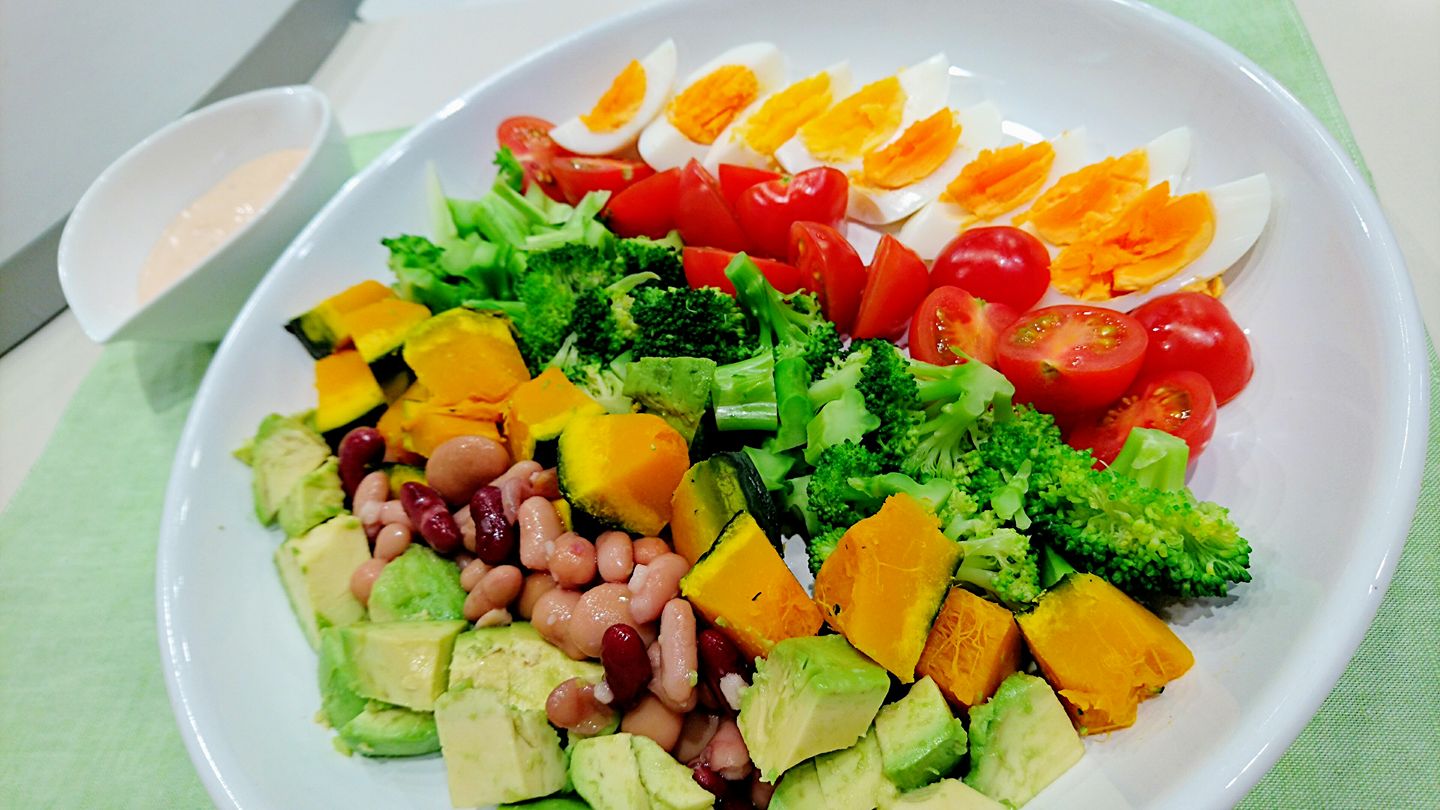 ⑤大皿にプチトマト、ブロッコリー、アボカド、ゆで卵を帯状に彩りよく並べ、ドレッシングを添える。