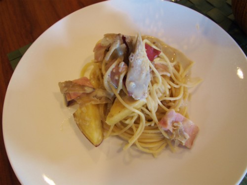 ゴボウとさつまいもを合わせて冬のパスタを作ってみました。