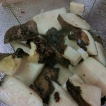 切った芋は鍋でやわらかく煮て、皮をむきます。