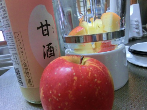 ①皮のまま半分ざく切りにしたリンゴを半個分、ミキサーに入れます。