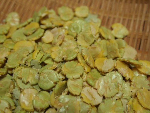 水に漬けてやわらかくした大豆を槌で叩いてつぶし、