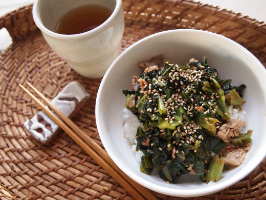 材料 ごはん、広島菜、豚こまぎれ、しょうが、ごま油、しょうゆ、酒、白ゴマ、めんつゆ