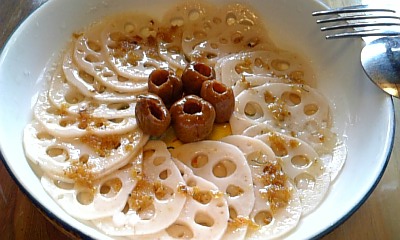 金木犀の花を漬けた蜂蜜で味をつけた蓮根