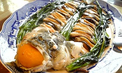 スズキの蒸し物 生ハムと筍と椎茸を重ねて