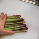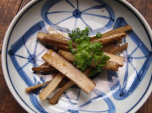 茎はフキと同じように茹ででスジを取ってダシで煮ました。